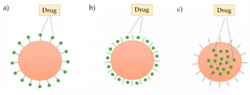 圖2. 樹枝狀大分子與藥物的三種結(jié)合方式,a) 共價連接;b) 靜電相互作用;c)包封